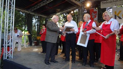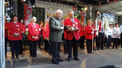 Grba überreichte dem Spielmannszug Vechelde zum 50-jährigen Jubiläum die Landesehrenplakette des NMV und ehrte anschließend Gründungsmitglied Hans Macinski (86) , der zuvor beim Auftritt der Ehemaligen noch die Becken geschlagen hatte und amtierender Schatzmeister des KMV sowie stellvertretender Kassenwart des Spielmannszuges ist, für seine 50-jährige aktive Mitgliedschaft im Spielmannszug mit der BDMV-Ehrennadel in Gold mit Diamant, Jahreszahl und Ehrenbrief. Er überreichte ihm außerdem für 30-jährige Tätigkeit im Vorstand des Spielmannszuges Vechelde die BDMV-Verdienstmedaille in Gold mit Diamant, Jahreszahl und Urkunde sowie für 30-jährige Tätigkeit im Landes-, Bezirks- und Kreisvorstand unter anderem als derzeit amtierender Kassenwart des Kreismusikverbandes Braunschweiger Land e.V. die BDMV-Ehrenmedaille in Gold mit Diamant, Jahreszahl und Urkunde.