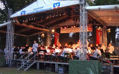 „Es ist uns gelungen, als besonderes Highlight für die Auftaktveranstaltung am Freitag, 31. August 2012, das Heeresmusikkorps 1 aus Hannover zu einem Benefizkonzert zugunsten der Jugendarbeit im Spielmannszug Vechelde, im Kreismusikverband Braunschweiger Land und der freien Jugendarbeit der Gemeinde Vechelde zu verpflichten“, freute sich unser Spielmannszug- und KMV-Vorsitzender Martin Robeck. Am Freitagnachmittag war hier zwar zunächst “Land unter“. Nach einem schweren regional begrenzten Gewitter mit sintflutartigen Regen- und Hagelschauern sah die für die Zuschauer vorgesehene Grünfläche unter den alten ausladenden Bäumen im Schlosspark am Bürgerzentrum eher wie ein riesiger Teich aus. Zu allem Überfluss drohte die 10 x 10 m große Bühne